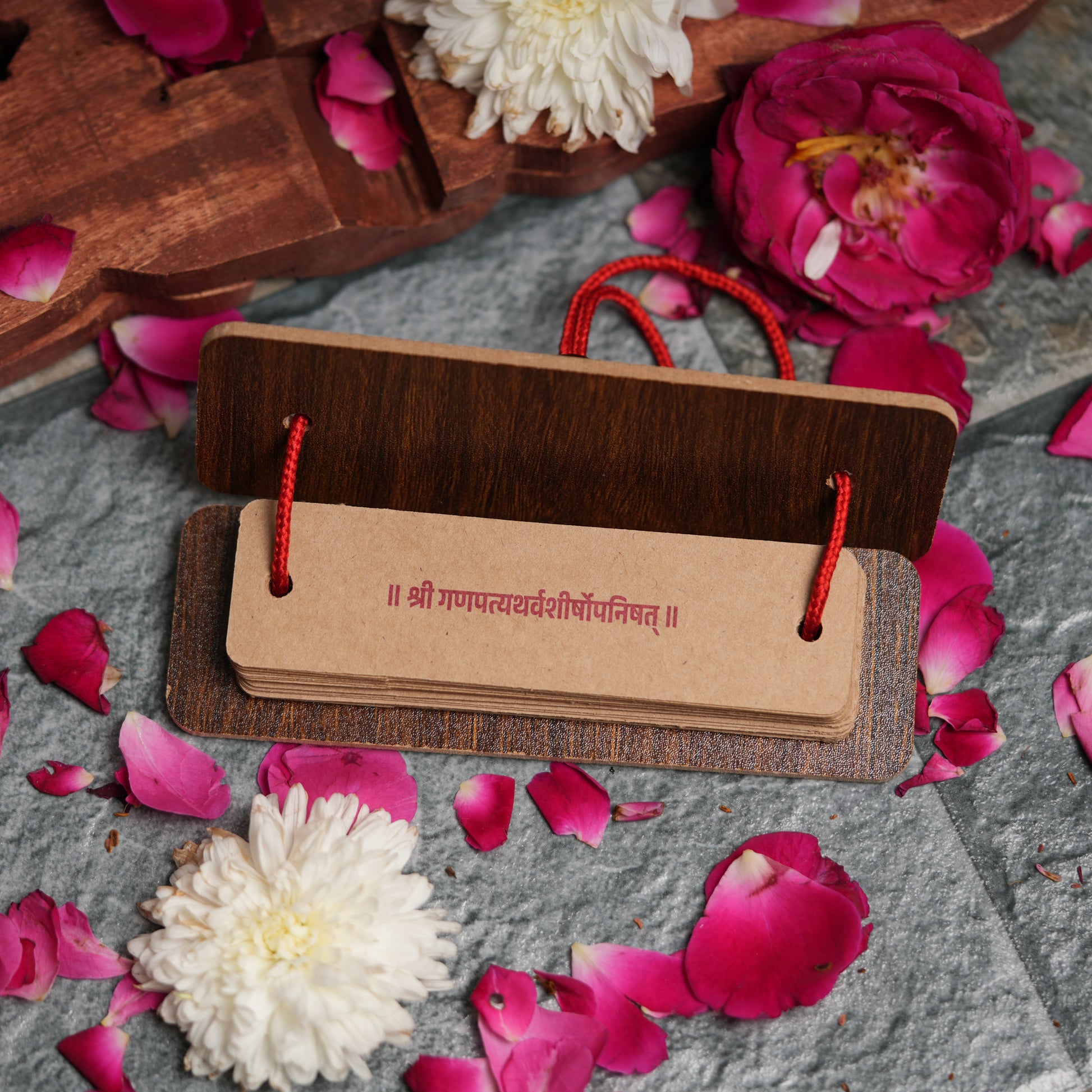 Embrace the wisdom and blessings of Shree Ganesha with the Ganapati Atharvashirsha (Ganapati Upanishad) in an elegant Pandulipi format. Sized at 5.7 x 1.8 inches, this sacred scripture is easy to carry and comes with a red velvet pouch to preserve its sanctity. Perfect for daily recitation or as a divine gift.