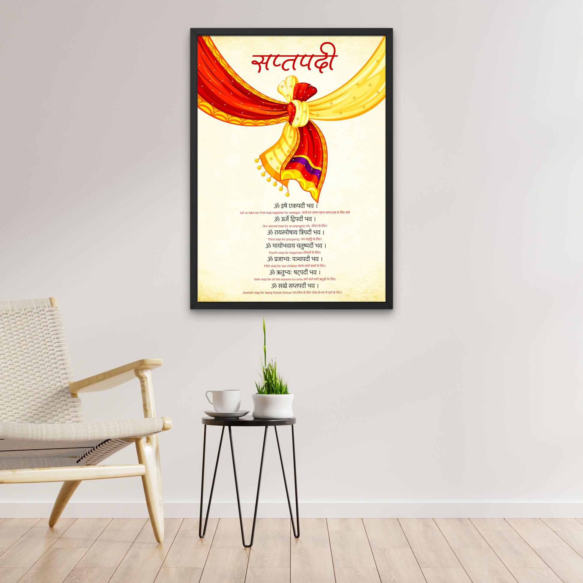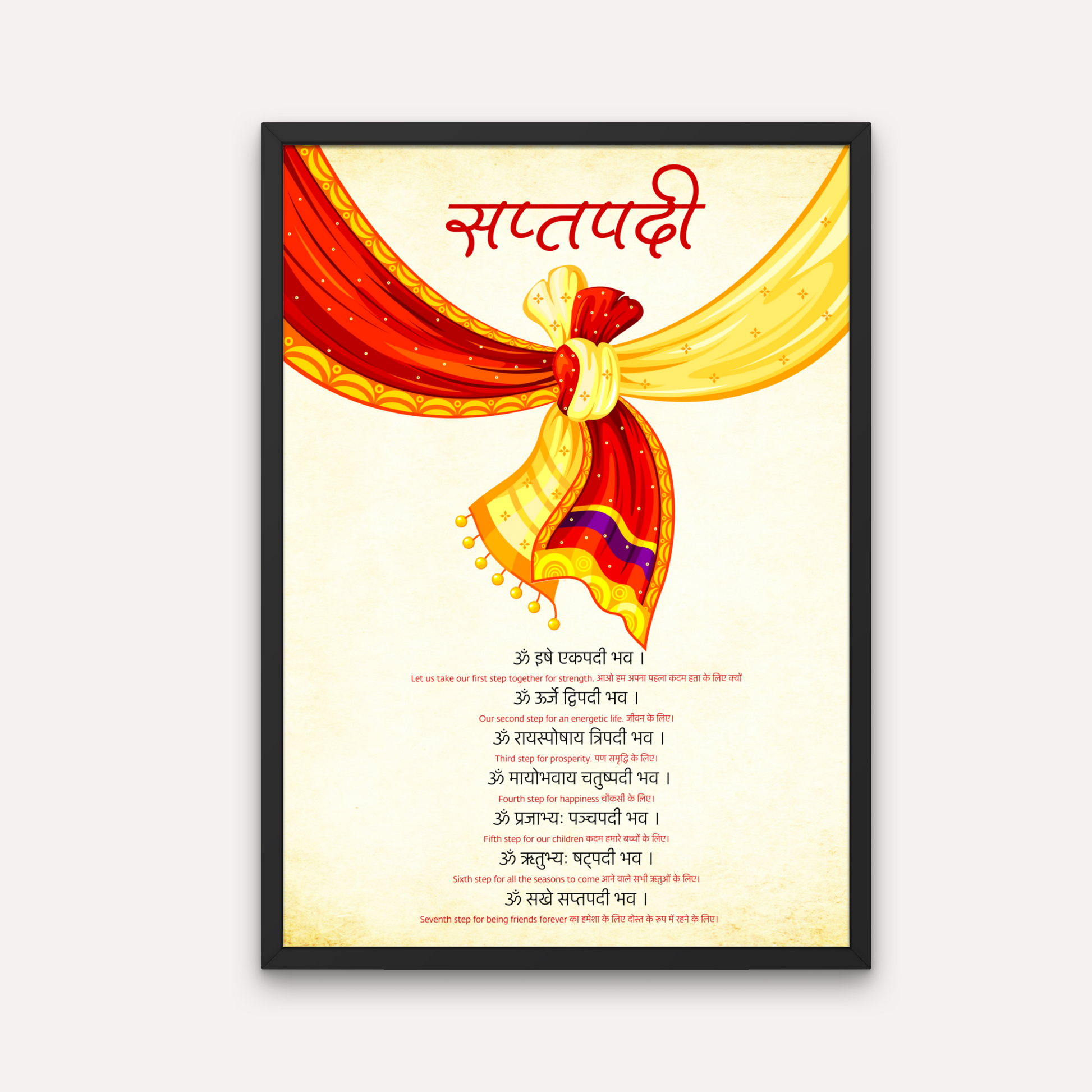 Celebrate the sacred bond of marriage with our beautiful Saptapadi Mantra poster. Made with high-quality materials, this poster makes the perfect gift for weddings and anniversaries. With its stunning design and powerful mantra, it serves as a meaningful reminder of the seven steps taken by the bride and groom in a Hindu wedding ceremony. Bring joy and blessings to your loved ones with this special gift.
